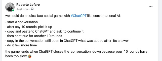Now, second joke, proposed a game to be done integrating ChatGPT with a human team, to see how group conversations would evolve: