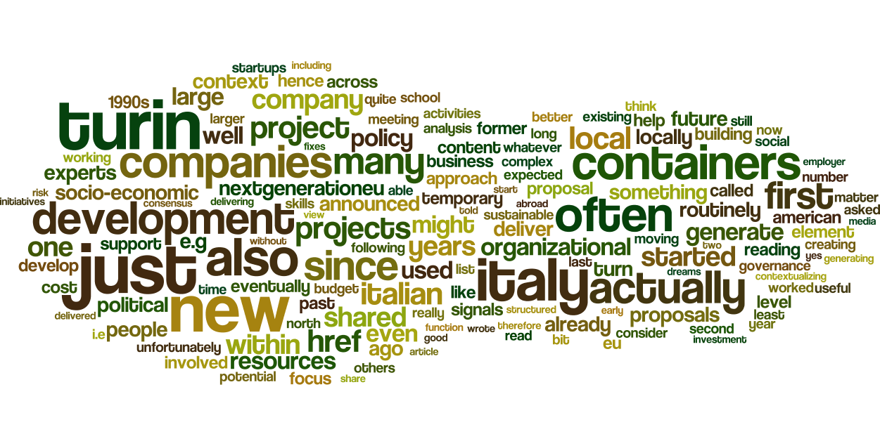 In Turin, two new major "containers" have been announced, which eventually will result in renovating existing buildings, e.g. the former Italia 61 exhibition area from the expo 1961 celebrating the 100th anniversary of Italy's unification, and the former stock exchange of Turin- and both, in one way or another, aim to "contain" innovative companies.