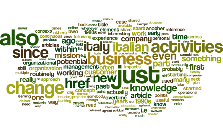 Since 2012, I had the chance to see how Italy (not just business, also State and society) really "evolved" since the late 1980s to early 1990s, when I had had a "business tour" lasting few years working for the Italian branch of an American consulting company, and then for the Italian branch of a French consulting and business software packages company, and compare with what I had seen in business since the late 1990s in UK, France, Switzerland while living abroad, and accepted an invitation to relocate to Brussels in 2005, hoping to settle there (I discounted the effects of Italian interferences, mainly from Turin and Rome).