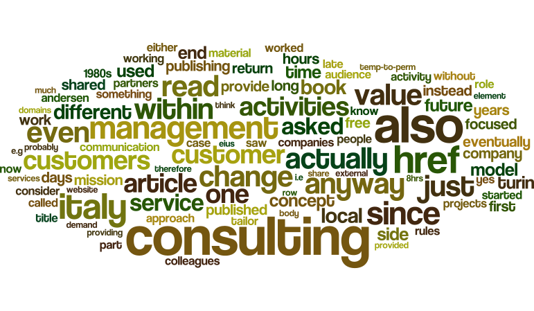 Therefore the website will be focused on sharing my concept of consulting- both the "descriptive" and "prescriptive" side, and eventually also to support other consultants (for free if they just read my material, paid if they prefer a "tailored" approach) to do what I have been asked as a "freebie" to provide since 2012.